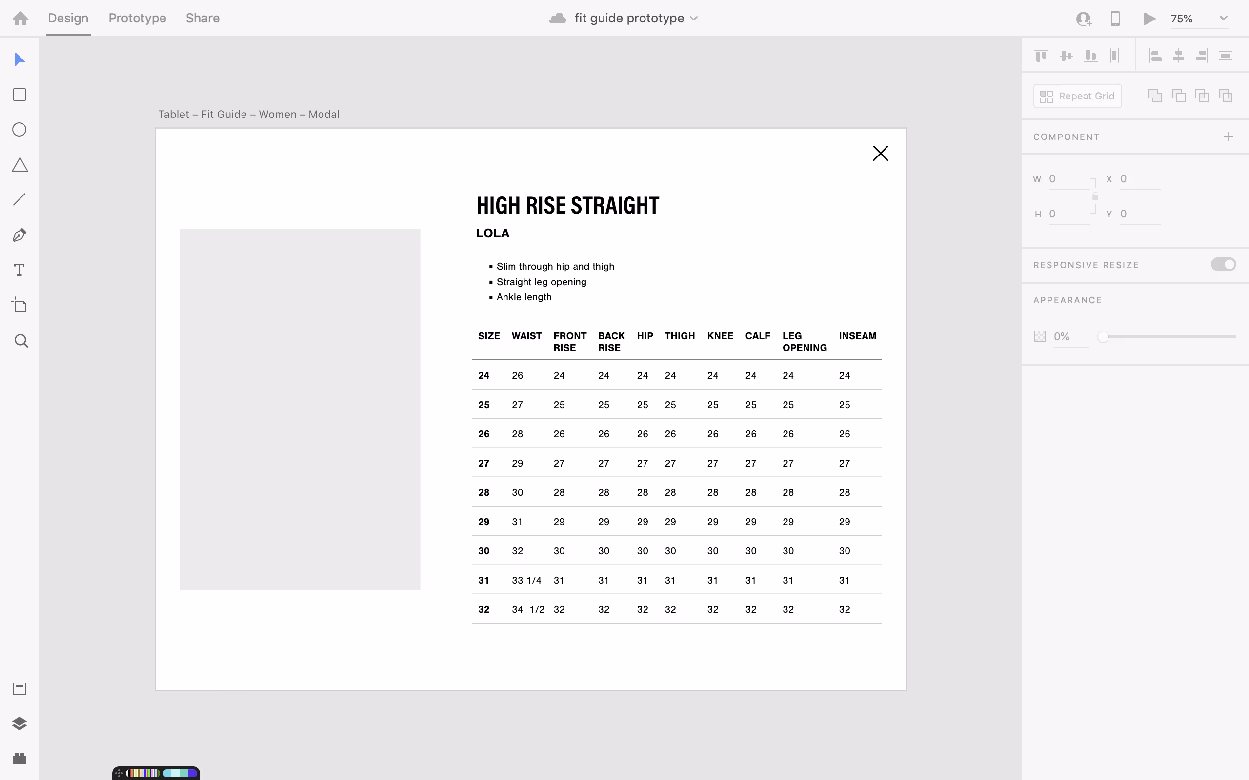 We ran into a few difficulties with the presentation of relatively large tables of sizing information on a mobile device. The team wanted to use modal windows but Safari in iOS doesn’t work as expected with modals. If the modal size requires a user to scroll, in iOS scrolling is very unintuitive. The background, as well as the modal, will scroll and sometimes the background will scroll while the modal will not. This required me to come up with creative solutions to keep the table concise while still intuitively presenting the information.